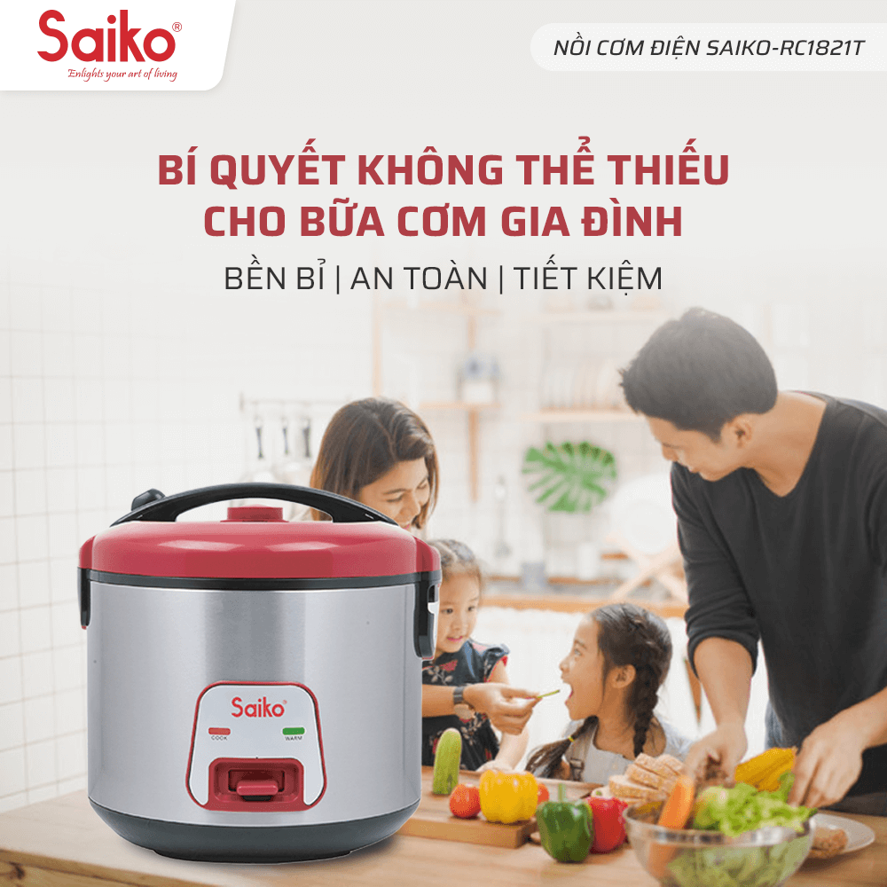 Nồi cơm điện Saiko RC - 1821T trở thành sự lựa chọn hàng đầu của rất nhiều gia đình bởi tính tiện lợi và đa năng. Sản phẩm sử dụng vô cùng dễ dàng và tiện lợi, bạn chỉ cần vo sạch gạo, bỏ vào nồi sau đó gạt sang chế độ nấu là sau 30 phút bạn đã có một nồi cơm nóng hổi, thơm ngon và không hề mất nhiều công sức.